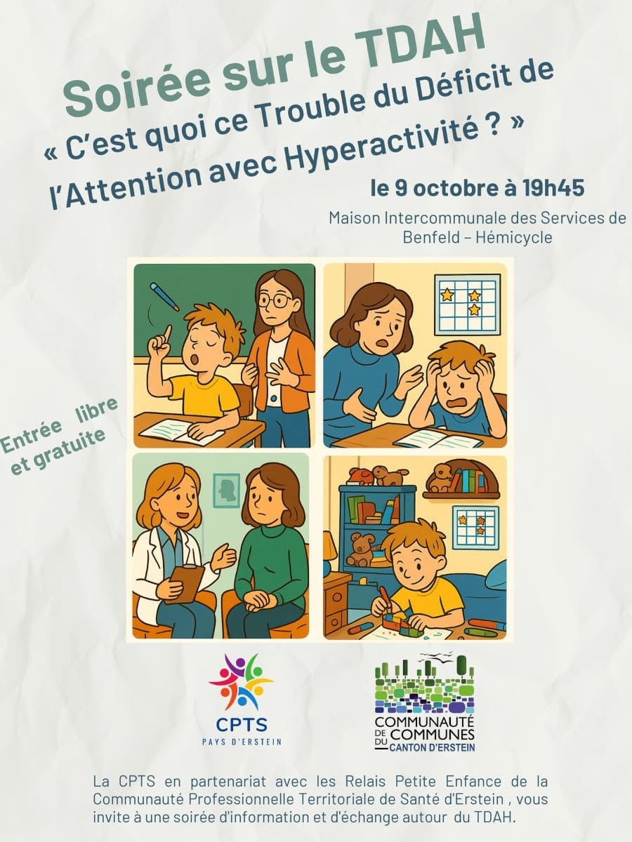 Une soirée ouverte à tous le jeudi 9 octobre à 19h45 à la Maison Intercomunicale des Services de Benfeld, organisée par le Relais Petite Enfance et la CPTS du Pays d’Erstein, pour mieux comprendre le TDAH et échanger autour de ce sujet.